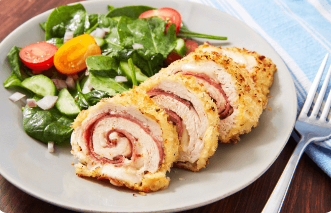 Обжарить курицу с двух сторон в растительном масле так, чтобы рулетики наполовину были погружены в него. Затем выложить на бумажные полотенца, чтобы избавиться от лишнего жира. В разогретой до 180 градусов духовке довести филе до готовности в течение 10–20 минут, в зависимости от размера филе.