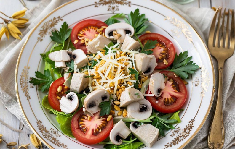 Сыр Сармич Маасдам натереть на крупной тёрке и добавить в салат. Помидоры порезать дольками.